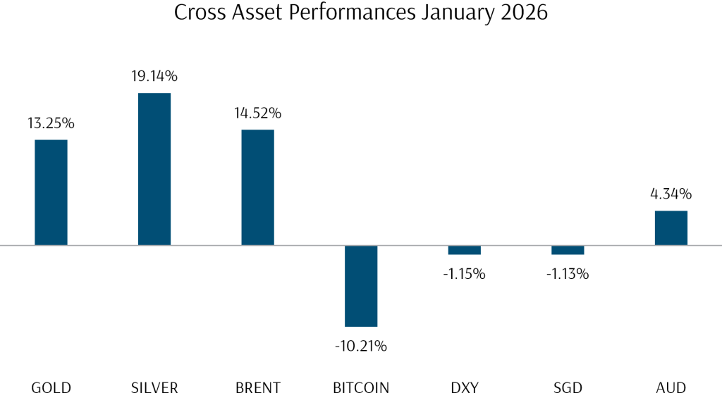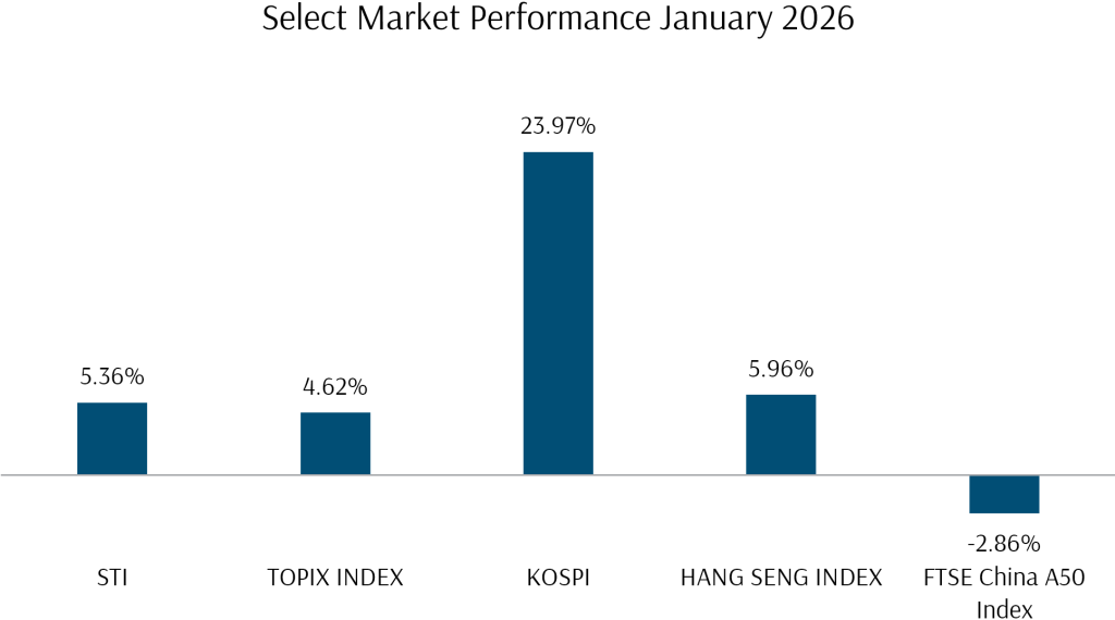 In other macro markets, activity was volatile and frenetic. The US Dollar Index extended its losses, falling 1.15% over the month following a similar fall in the previous month. The US dollar lost similar ground against the SGD, and bearish sentiment prevailed through the month, following the twin episodes of Venezuela and Greenland. The announcement of Kevin Warsh as the next Fed Chair appeared to create a temporary floor beneath the dollar, restoring some semblance of regularity to currency markets.