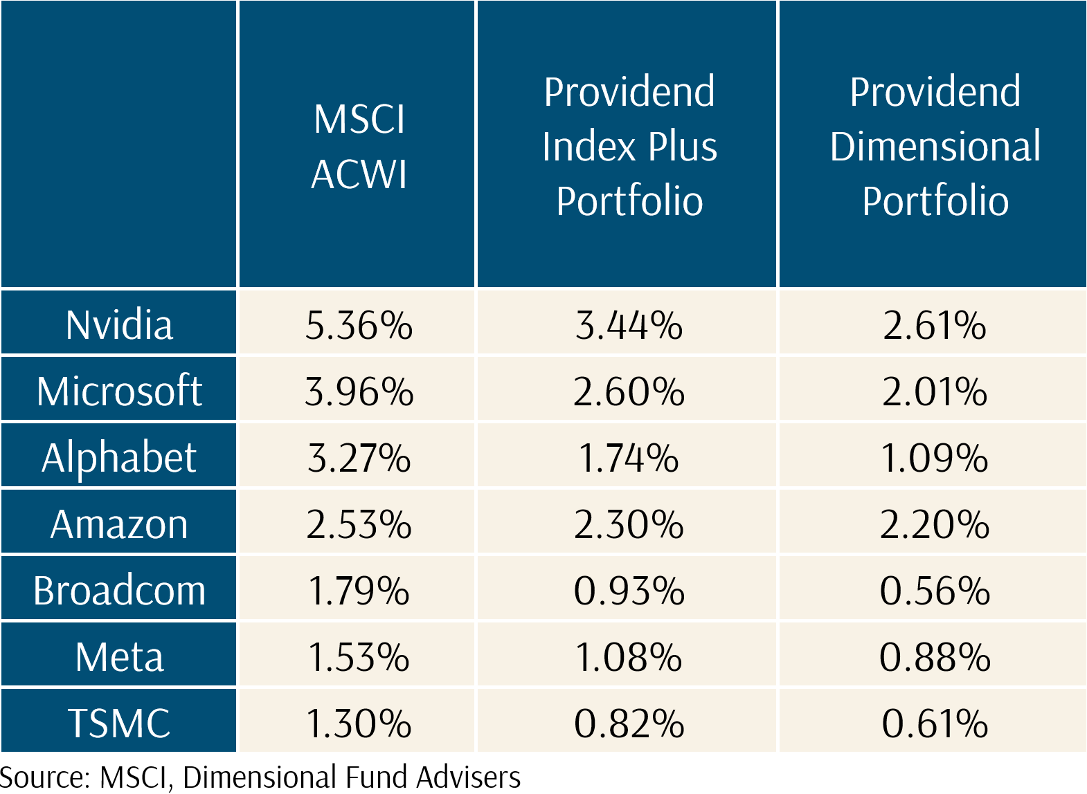 At Providend, our portfolios are tilted towards value stocks, which means that on average, our portfolios hold less than the typical index weight of the AI-related stocks, as those stocks are currently trading at much higher valuations. (Do note that these allocations are estimates, and are constantly changing due to market moves, but are broadly around those levels)