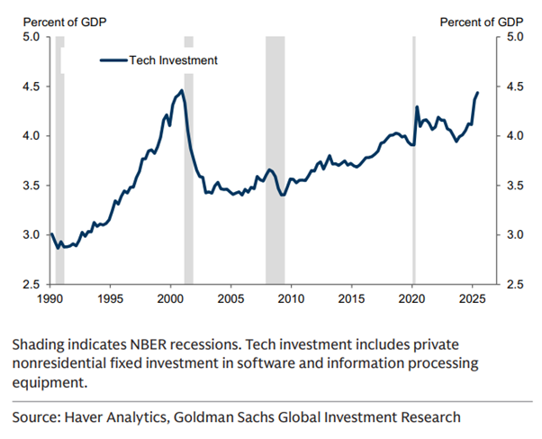 The chart above shows tech investment as a percentage of GDP, and while it has been going up, it has started from a much higher base than in the 1990’s. This is significant because it shows that if anything, the capex into AI so far is not too outsized. A 0.5% of GDP growth in capex from tech is not something that is too extreme. In fact, compared to the investment levels in 2000, the current investment in AI by hyperscalers and other tech firms is much smaller as a percentage of GDP, so if taking indicators from the dot-com era, then we are still some ways away yet, if at all.