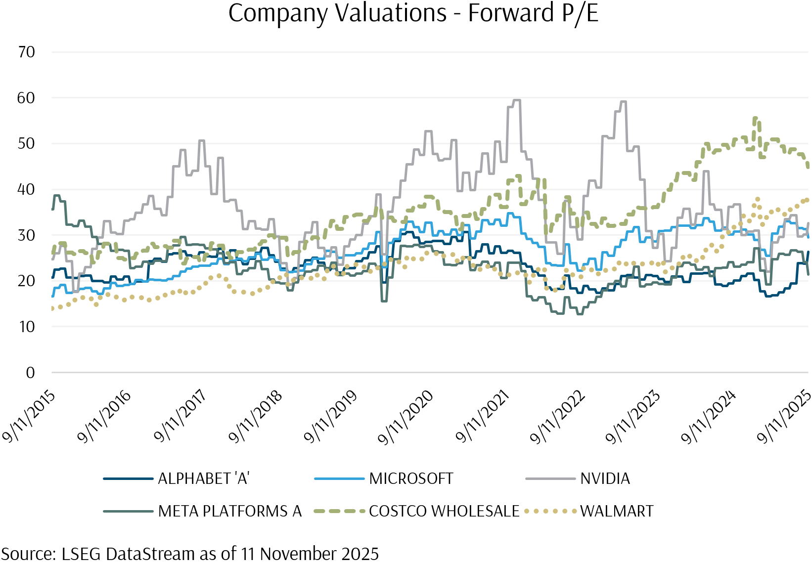 For further perspective, we can take a closer look at valuations under the hood. The following chart shows the forward P/E of 3 major AI-related mega-cap technology companies (Microsoft, Google and Meta), and 2 other non-AI companies (Costco and Walmart). None of the AI-related companies are currently trading at valuations higher than that observed over the past ten years. In fact, both Alphabet (Google) and Meta are trading at reasonable valuation discounts to recent historical ranges. In contrast, Costco and Walmart, which are household names in the US that no investor would associate with AI, are trading at significantly higher valuations while generating considerably lower growth.
