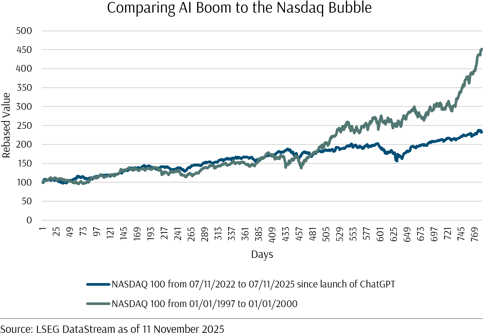 In recent weeks, there has been a growing crescendo of “bubble talk” by financial market commentators as the S&P 500 continues to make new highs, driven by the spectacular growth of AI related stocks. Undoubtedly, this is because the spectre of the late-1990s technology bubble looms large in the collective memory of investors, creating understandable anxiety when observing today’s market dynamics.