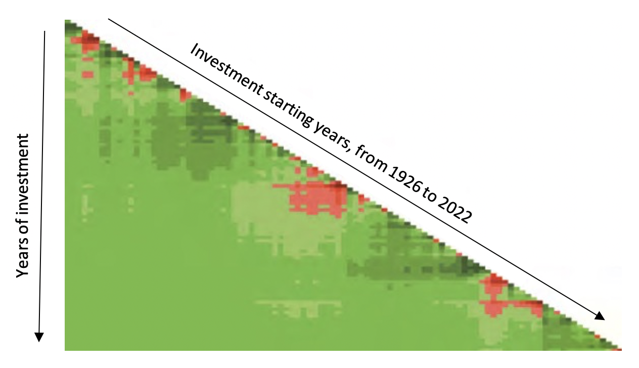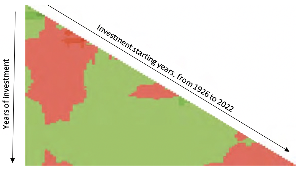 To illustrate this point, here is a heat map of historical returns of US Treasury Bills from 1926 to 2022, after factoring in inflation, with green representing positive returns and red representing losses. The diagonal border represents the different starting years of investments, which shows the returns across various holding periods as you move down. And what it tells us is that there are a lot of periods where T-Bills end up with negative real returns over time.