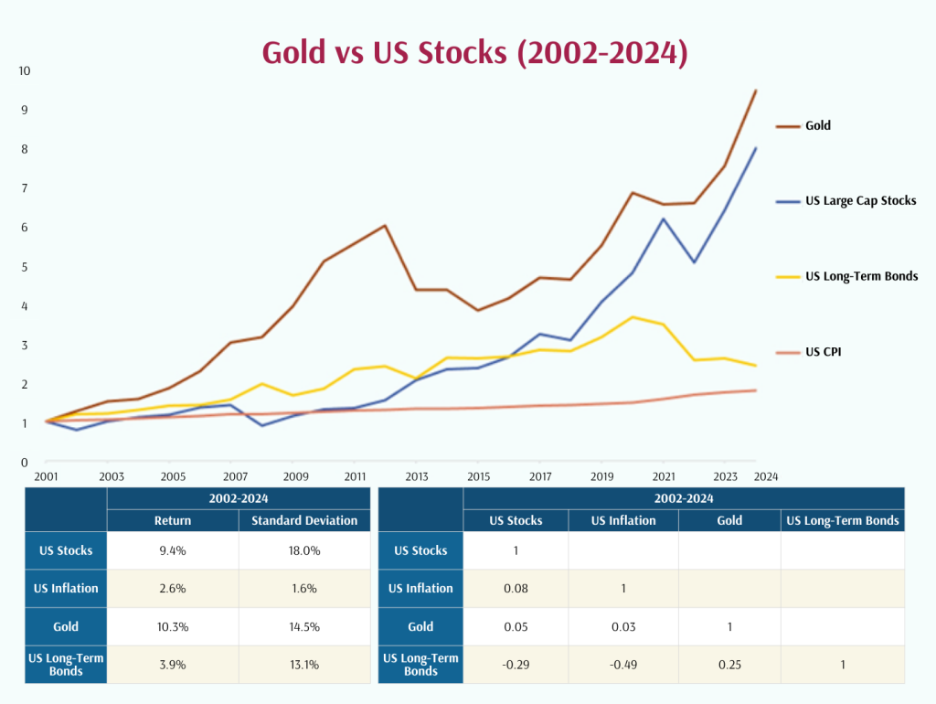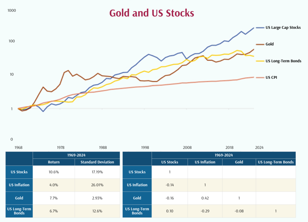 Looking at the long-term weighted average rate of return of gold, over the past 33 years from 1991 to the end of last year, it was approximately 5% per year. If we look at the US bonds during the same period, it was about 6%, and the US stocks were about 10%. So, gold can outperform short-term bonds and inflation, but it cannot outperform long-term bonds, let alone stocks. This is one of its characteristics.