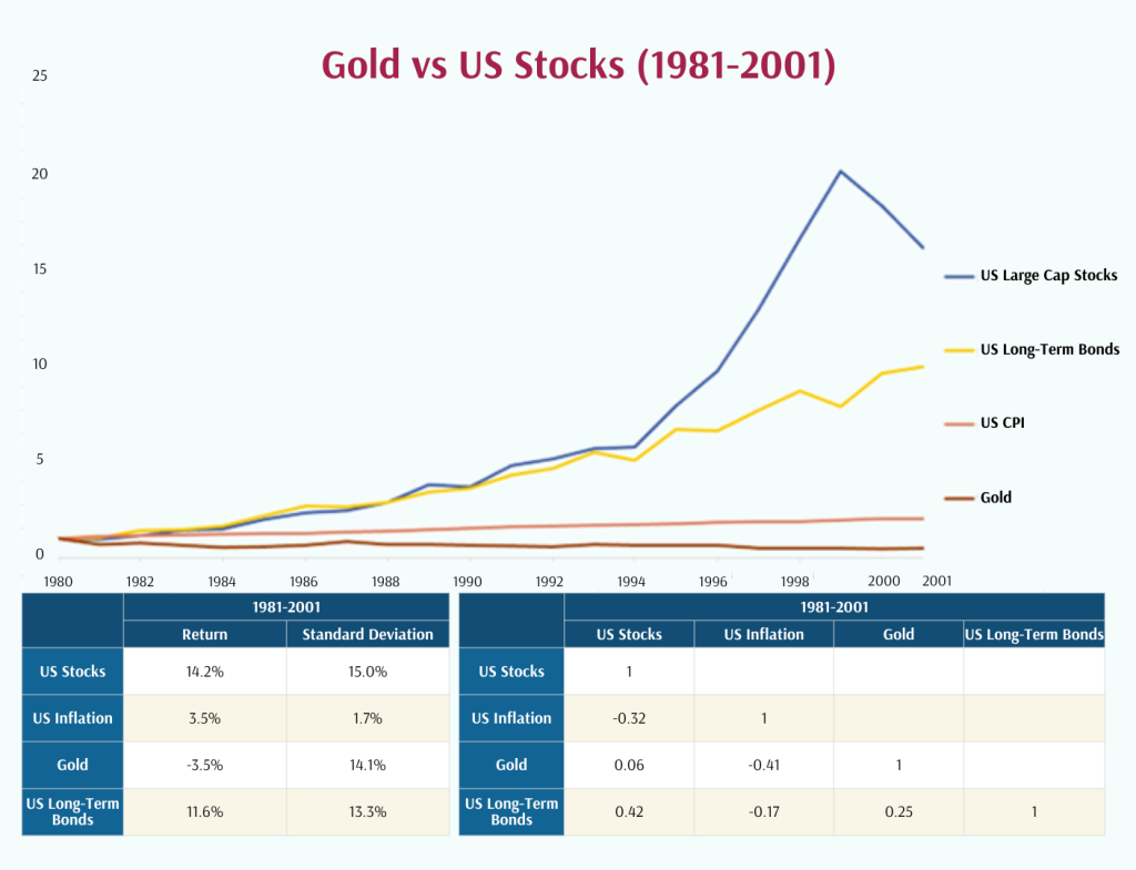 Table 5 shows that during this period, the average inflation rate was only 3.5%. Gold depreciated relative to the US dollar (paper currency), and the return on investing in gold was negative. However, stocks and bonds achieved returns of over 10%.