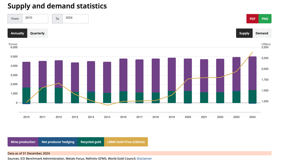 For example, if my gold ring is worn out or I no longer want my gold necklace, I can recycle them. Gold in electronic components can also be recycled, and this part accounts for about 20% of the supply. Changes in the supply side are relatively slow. First, you need to discover a gold mine. Then, you have to extract it and smelt it. All these processes require investment. You need to establish a company, obtain licenses, find equipment for mining, and build a smelter to gradually smelt the gold. Therefore, it may take several years from the intention of gold production to the actual output of gold. Thus, in terms of the supply side, the change in its output cannot be rapid.