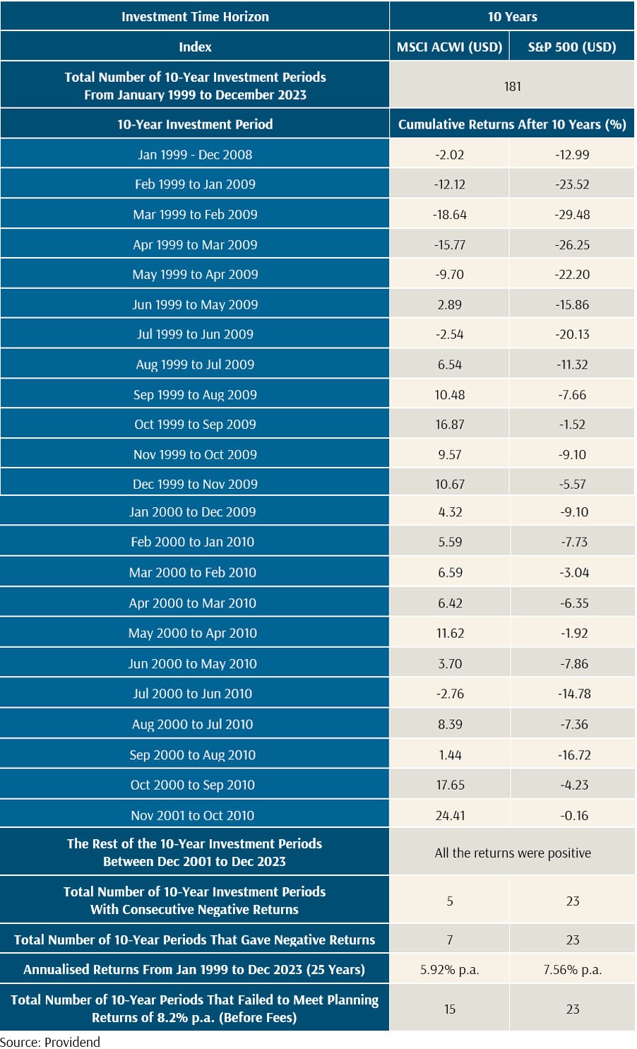 - For the MSCI ACWI, you will notice that there were 7 negative 10-year investment periods in the 25 years, but for the first 5 months of 1999, regardless of the month an investor started investing in, after 10 years, his returns were always negative. For the S&P 500, it was worse. There were 23 negative 10-year investment periods and they all happened in the first 23 months of the 25 years. This means that between Jan 1999 to Nov 2001, regardless of the month an investor started investing in, after 10 years, his returns were always negative.