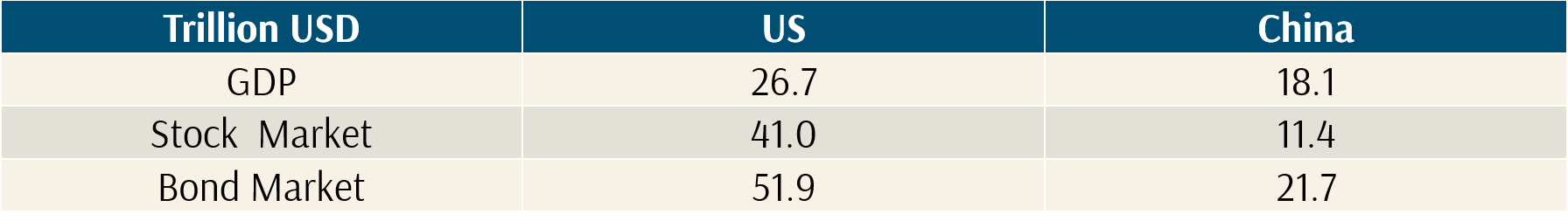 Table 1: US and China GDP, Stock Market Size and Bond Market Size