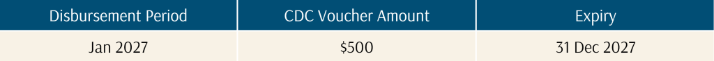Every Singaporean household will receive $500 in CDC vouchers. Half can be used at participating supermarkets; the other half can be used at participating heartland merchants and hawkers.