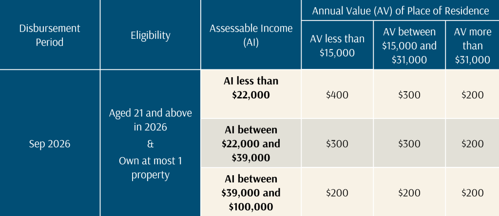 Eligible adult Singaporeans will also receive a one-off cash payout of $200 to $400 to help manage daily expenses.
