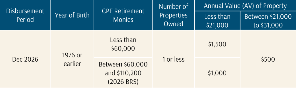 To enhance retirement adequacy, Singaporeans aged 50 and above in 2026 will receive a one-off means-tested CPF top-up, provided they are residing in Singapore.