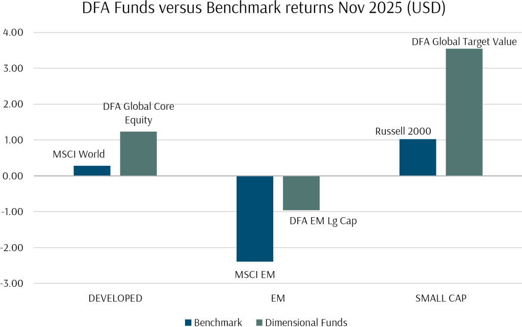 The Dimensional Global Core Equity Fund gained 1.23% in November, outpacing the MSCI World Index return of 0.28%. The MSCI EM index closed November with a -2.39% return – however the Dimensional EM Large Cap Core Equity Fund was down a much more modest -0.96%. Compared to benchmark indices, both Dimensional Funds are more diversified by sector and country, and incorporate tilts towards lower valuation and smaller capitalisation stocks. The Dimensional Global Targeted Value Fund, which incorporates heavier tilts in both factors, returned 3.54% in November, an outstanding result considering the turbulent journey markets experienced throughout the month