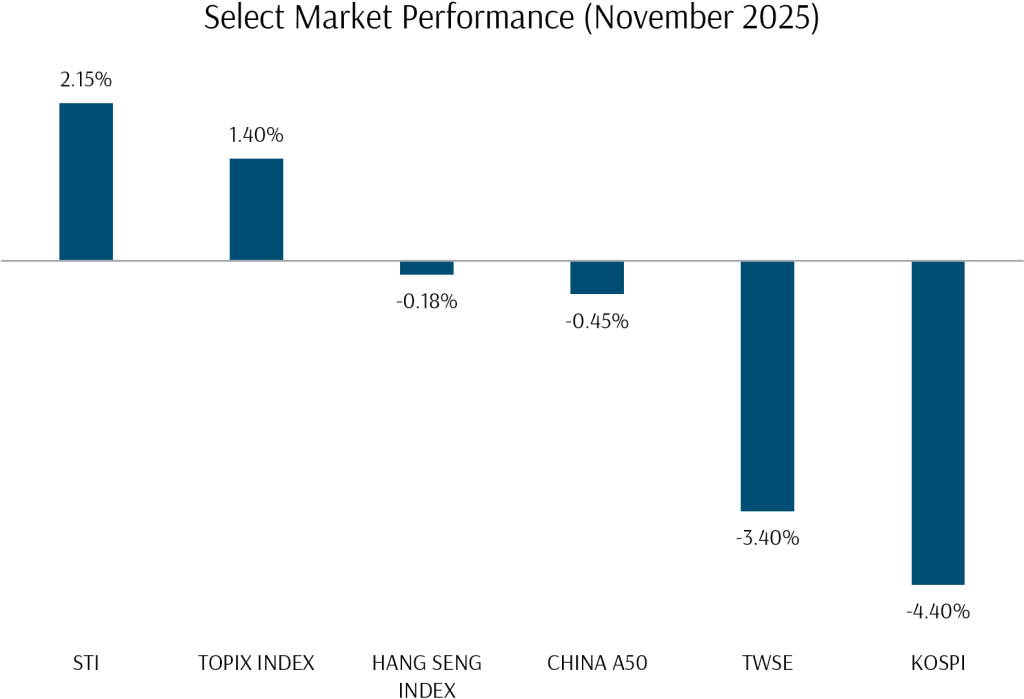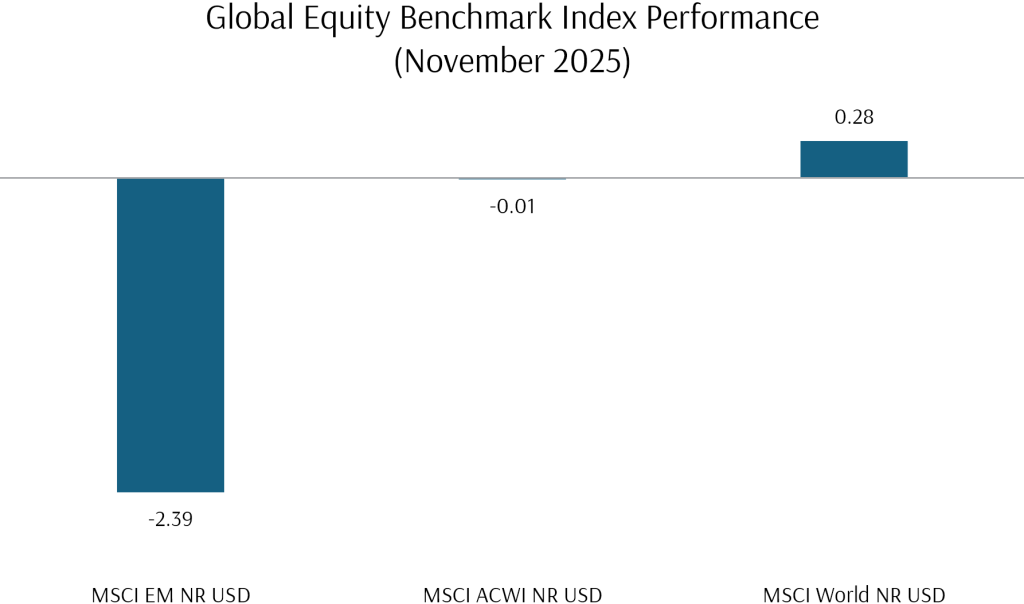 November’s global market performances reflected developed market volatility and profit-taking in Emerging Markets on the back of somewhat soured AI-sentiment impacting Asia’s technology giants which had notched outstanding gains in the prior month.