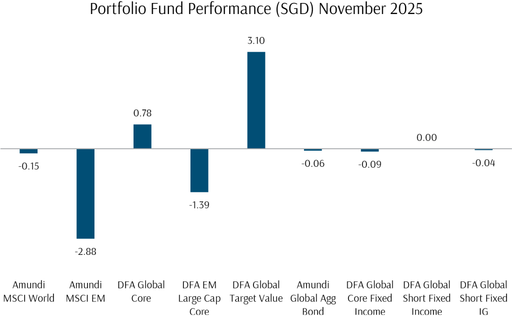 Portfolio fund performances were mixed amidst the volatility of November. Despite significant weakness in the US dollar over the month, SGD share classes were able to substantially mitigate FX impacts on eventual returns.