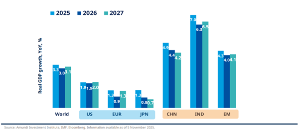 Emerging Asian economies are expected to remain a primary engine of global growth in 2026. Forecasts for China and India, while slightly lower than 2025, still imply robust growth of roughly 4 to 6% next year. Amundi notes that even if China and India moderate from 2025’s strong pace, Asia will continue to outpace other regions. ASEAN economies are seen growing in the 4 to 5% range. Emerging Asia also benefits from the global tech cycle with Asian exporters leveraging into the AI boom with strong semiconductor and electronics demand acting as a tailwind even amid US/China trade tensions.