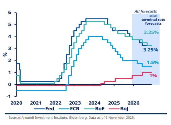 The European Central Bank’s policy is expected to follow a similar easing trajectory. Eurozone inflation has fallen faster, and growth is weaker, giving the ECB scope to cut rates through 2026. Amundi forecasts the ECB’s deposit rate falling to about 1.5% by mid-2026, from 2.00% in late 2025.