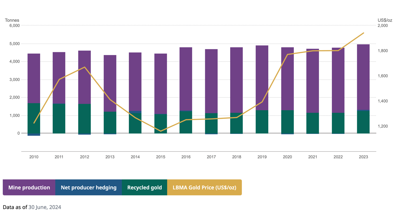 Gold supply mainly comes from two sources: mine production and recycling. The total annual supply is fairly stable around 5,000 tons a year, with mine production representing around 80% and recycling representing the rest, 20%.
