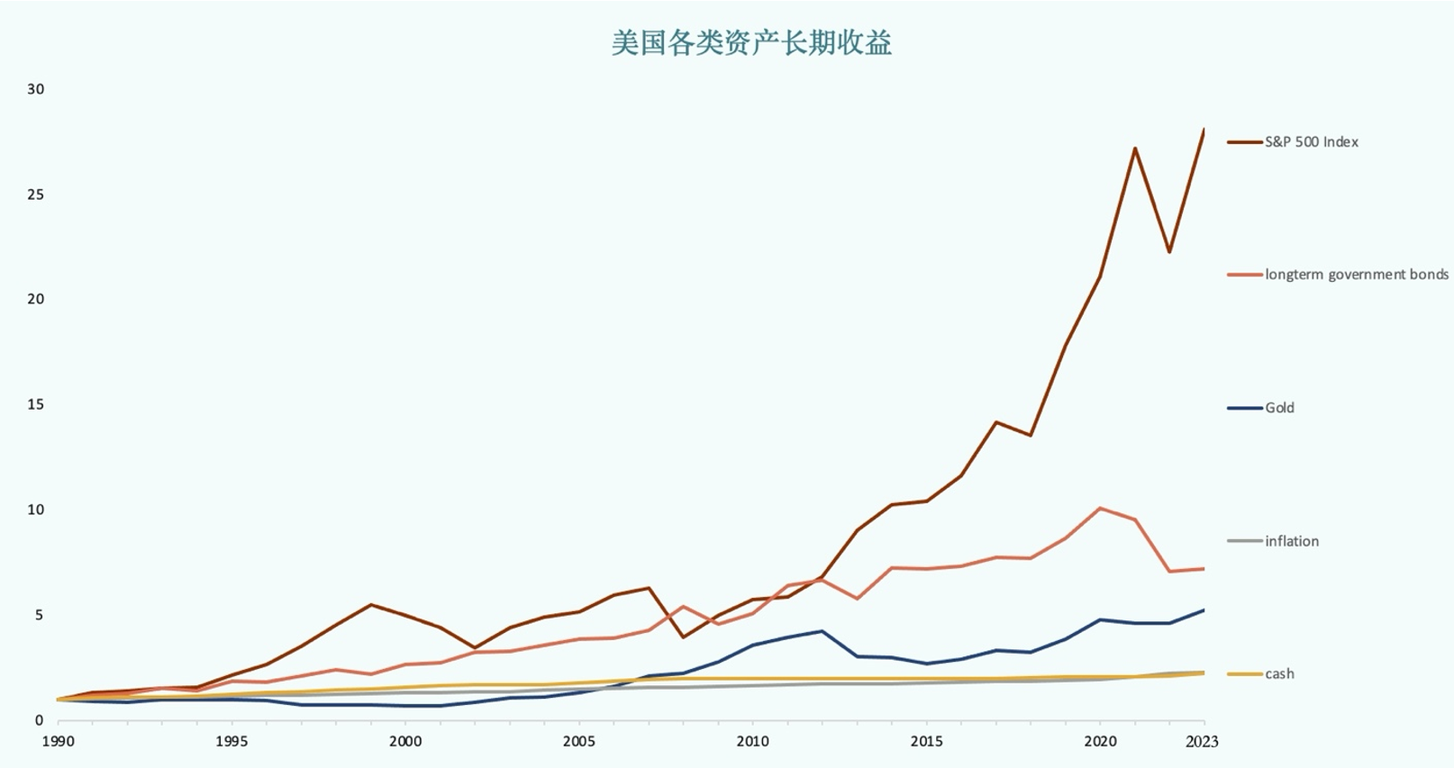 Next, let us take a look at the historical risk and return characteristics for gold (assuming buy and hold), along with traditional stocks and bonds. Gold price volatility and returns: The annualised return of gold has been about 5% in the past 33 years (from 1991 to the end of 2023), and the volatility of gold is about 15%, which is slightly lower than the volatility of stocks.