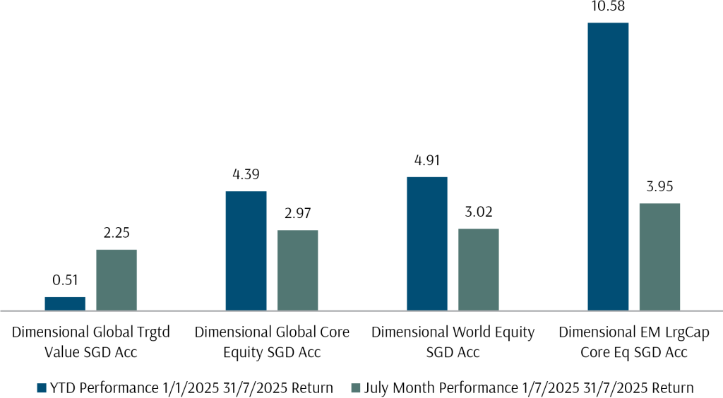 Exhibit 1: Dimensional Equity Fund Performance in SGD July 2025 and YTD 31 July 2025
